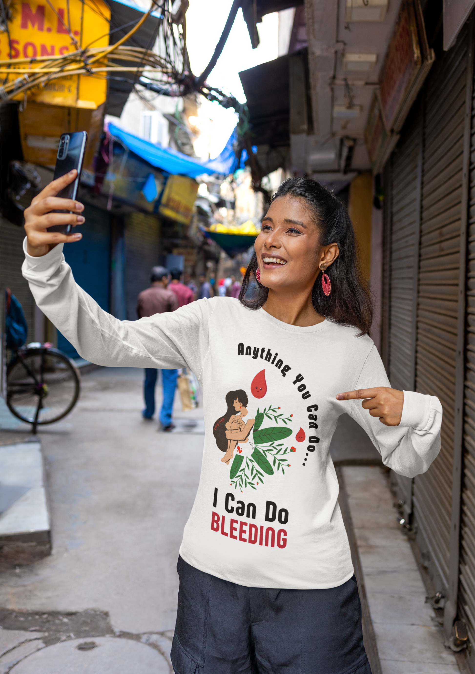 he 'Anything I Can Do, Yes I Bleed' full sleeve women's t-shirt is part of Girls Buzz's exclusive series addressing period stigma, where we aim to challenge the limitations and shame society places on women and girls when they menstruate. It's a normal body function, and it's high time everyone gives up stereotypes related to periods for good. Let's proudly accept that yes, we menstruate, rather than hiding it in shame.