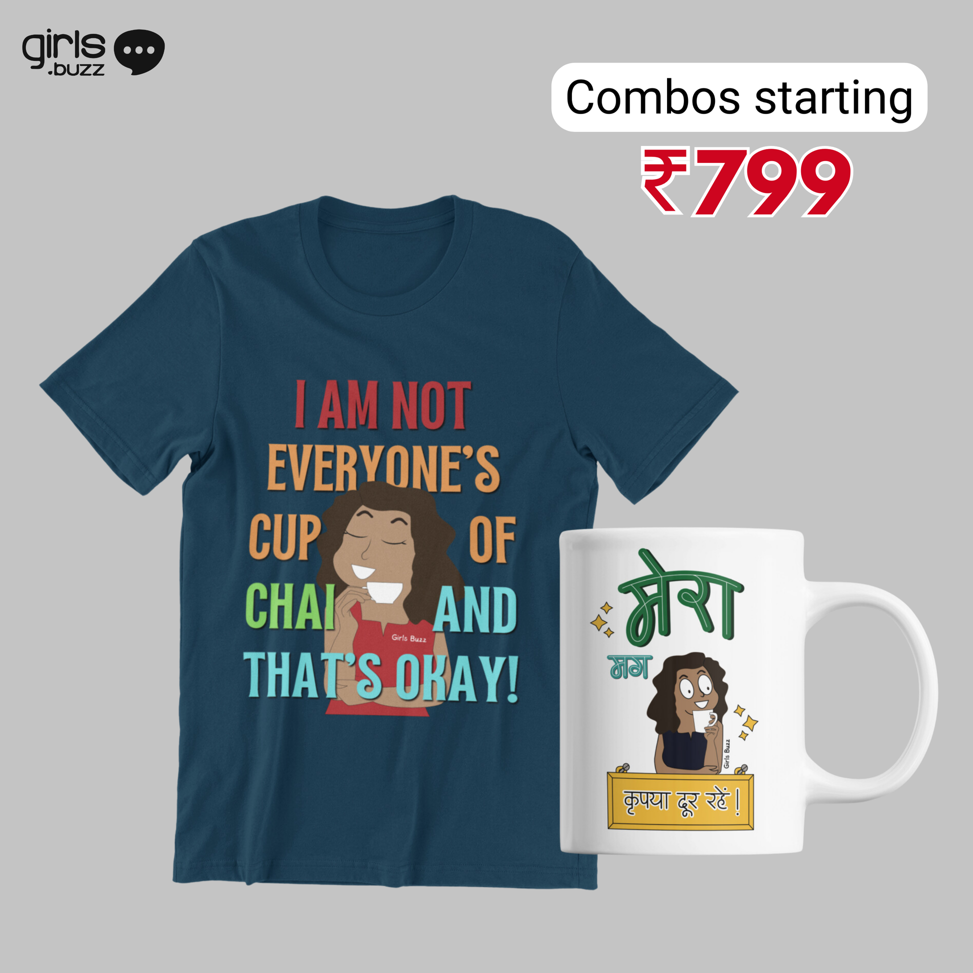 The 'Mera Combo,' is a delightful set that celebrates the strength and individuality of women. This combo includes the classic Hello Mili cotton t-shirt featuring the empowering quote 'I am not everyone's cup of chai' and the 'Mera Mug,' both designed to make a bold statement.