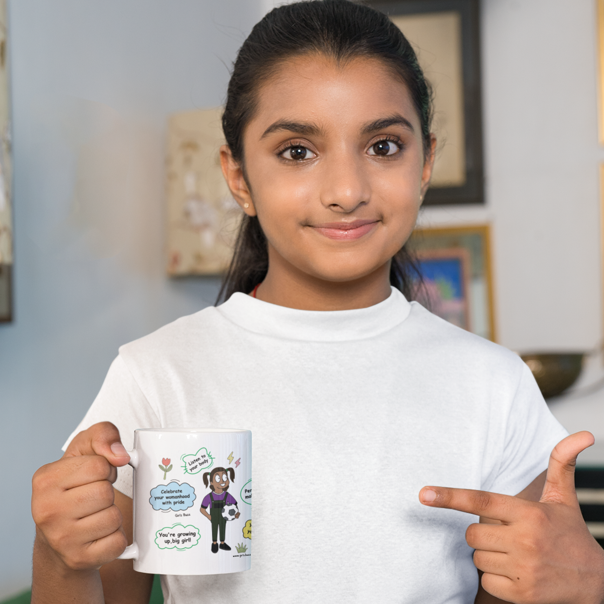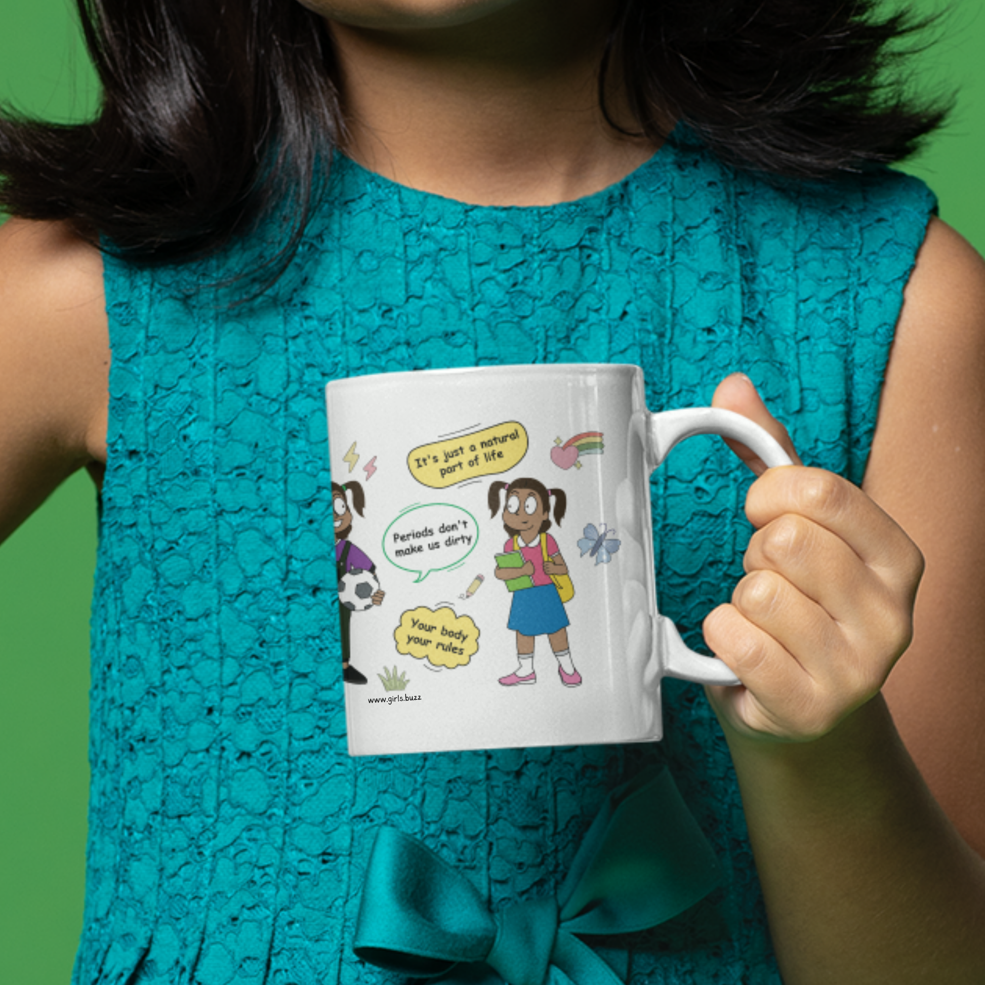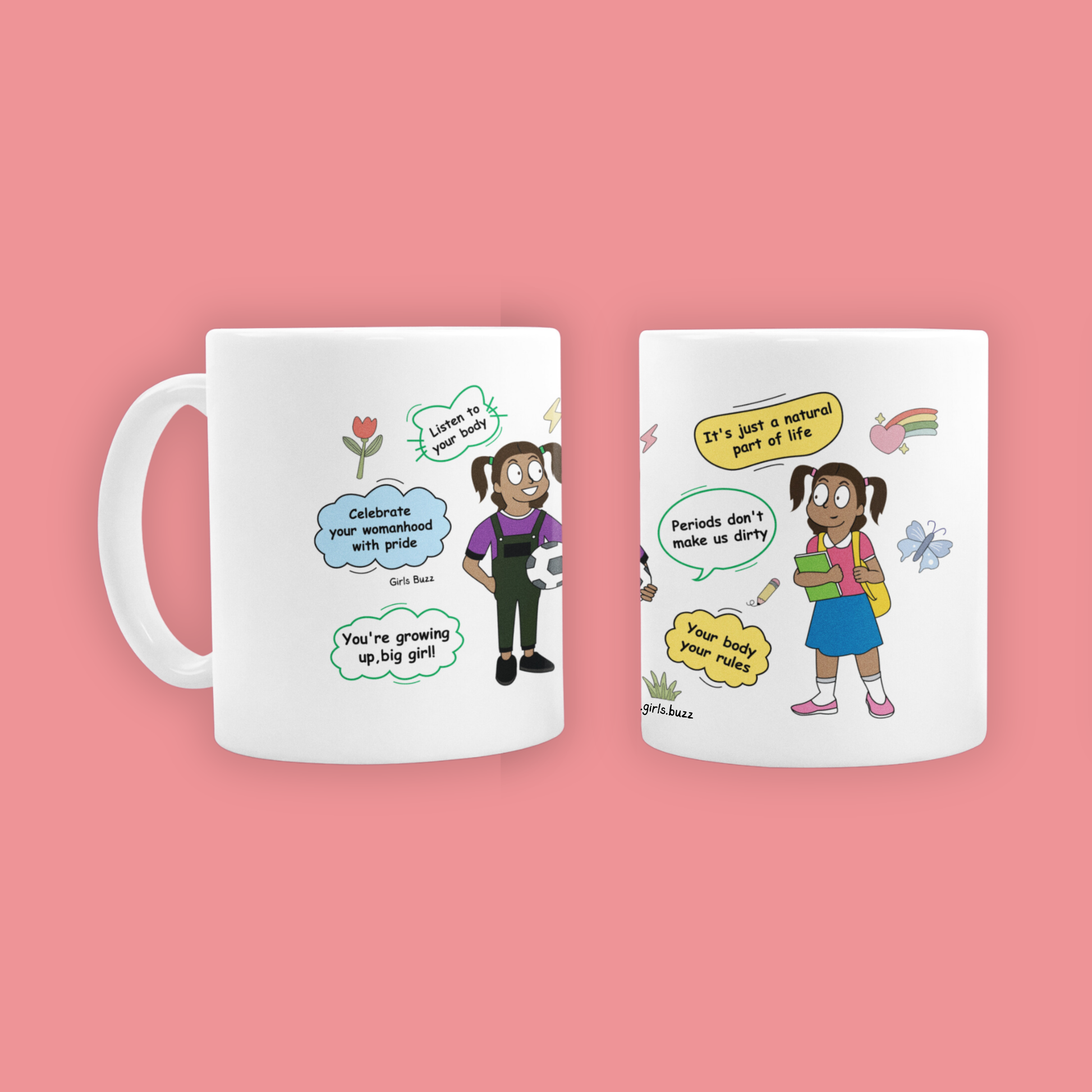 Why not celebrate when a young girl becomes a young woman with the start of her periods? She deserves a gift, and the Girls Buzz 'Period Congratulations Mug' from the Hello Mili comic series is the perfect choice. This mug is designed to make her feel positive and motivated, reminding her that menstruation is not a taboo but a normal, natural part of life.