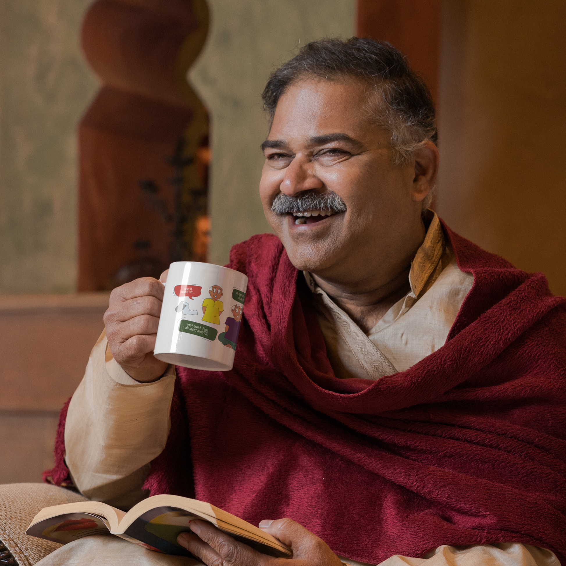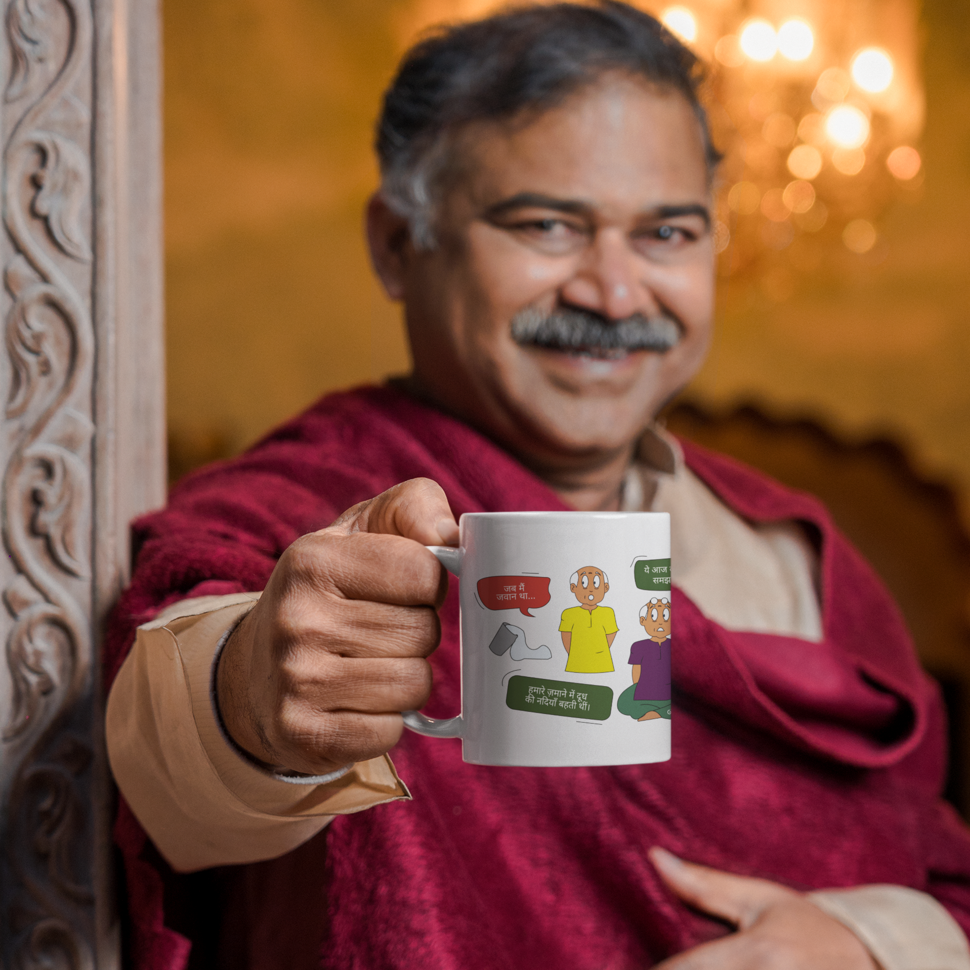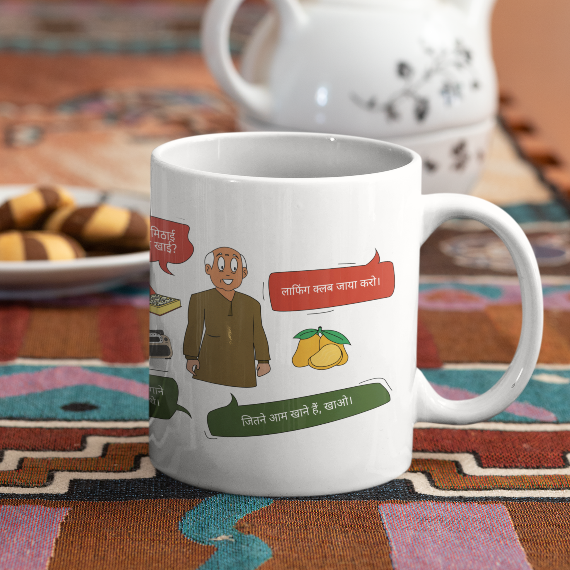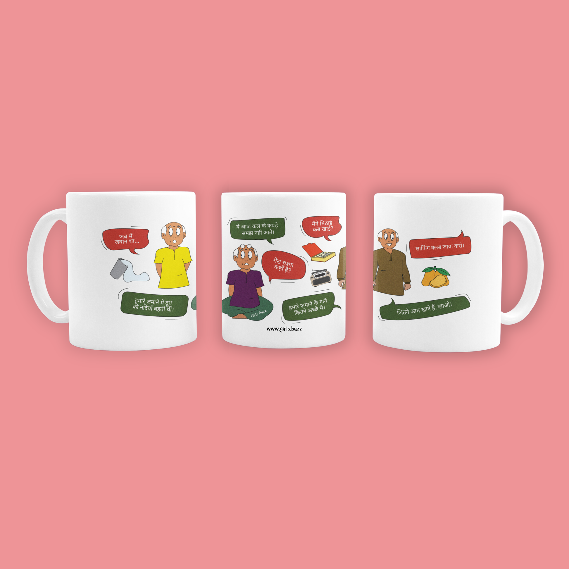 sn’t it funny how Dada always has his own set of never-ending complaints, from misplacing his specs to sneaking an extra sugar cube into his tea? Capture all his quirky habits with the Dada and His Complaints mug featuring fun quotes from Hello Mili comics! With humorous Hindi lines, this mug celebrates Grandpa's lovable and forgetful nature. Perfect for birthdays or just a thoughtful gift, this special Girls Buzz Indian family collection reminds us how much we adore Dada, complaints and all!