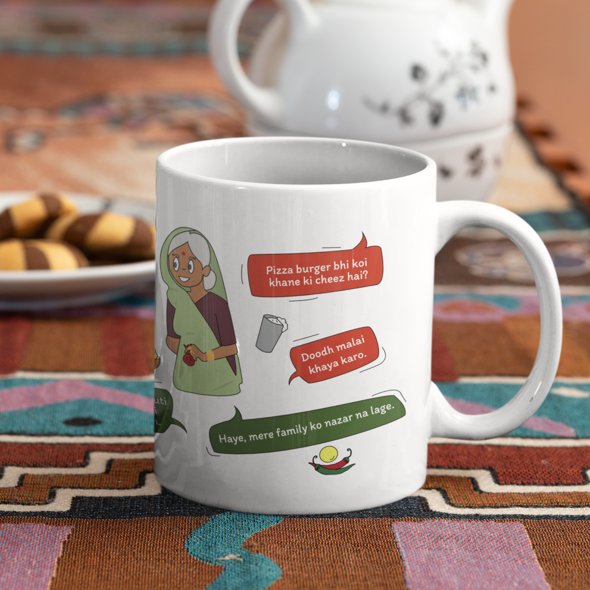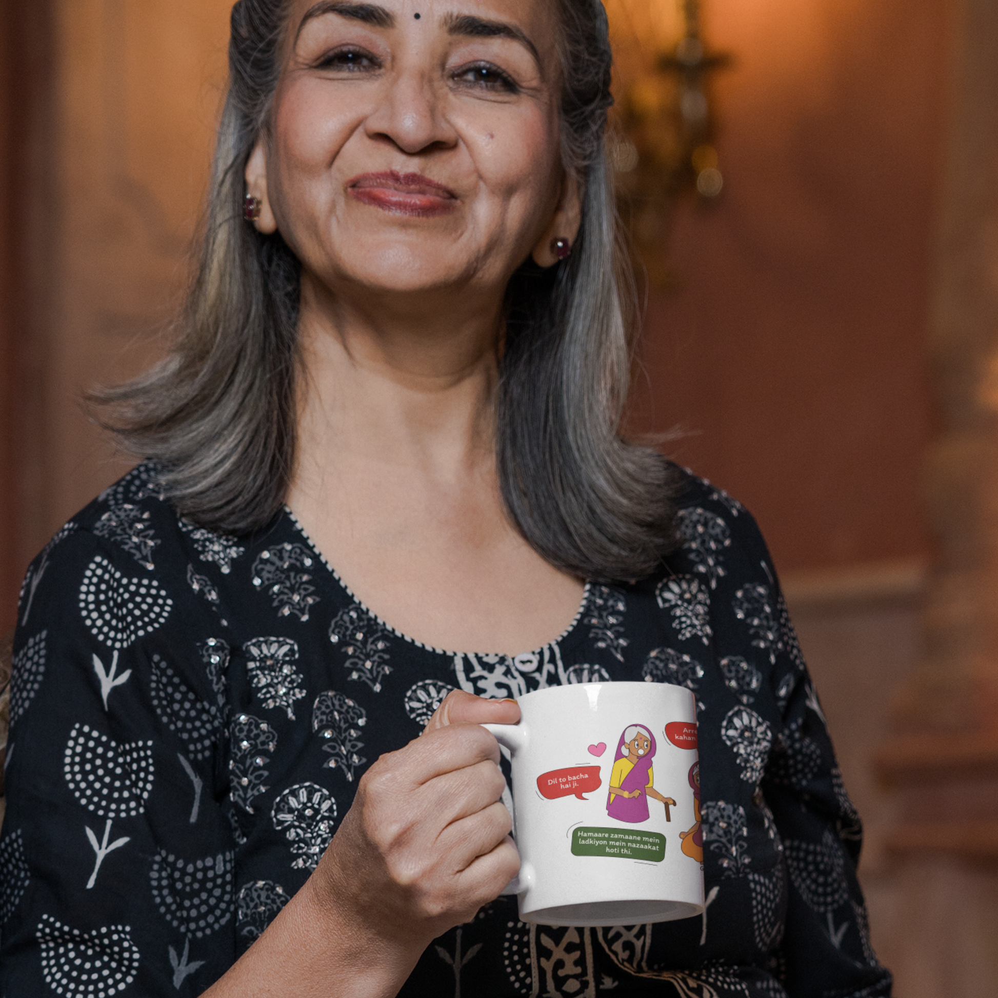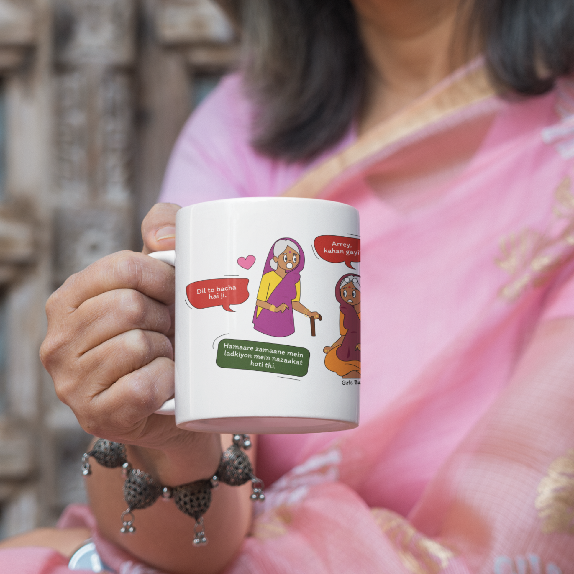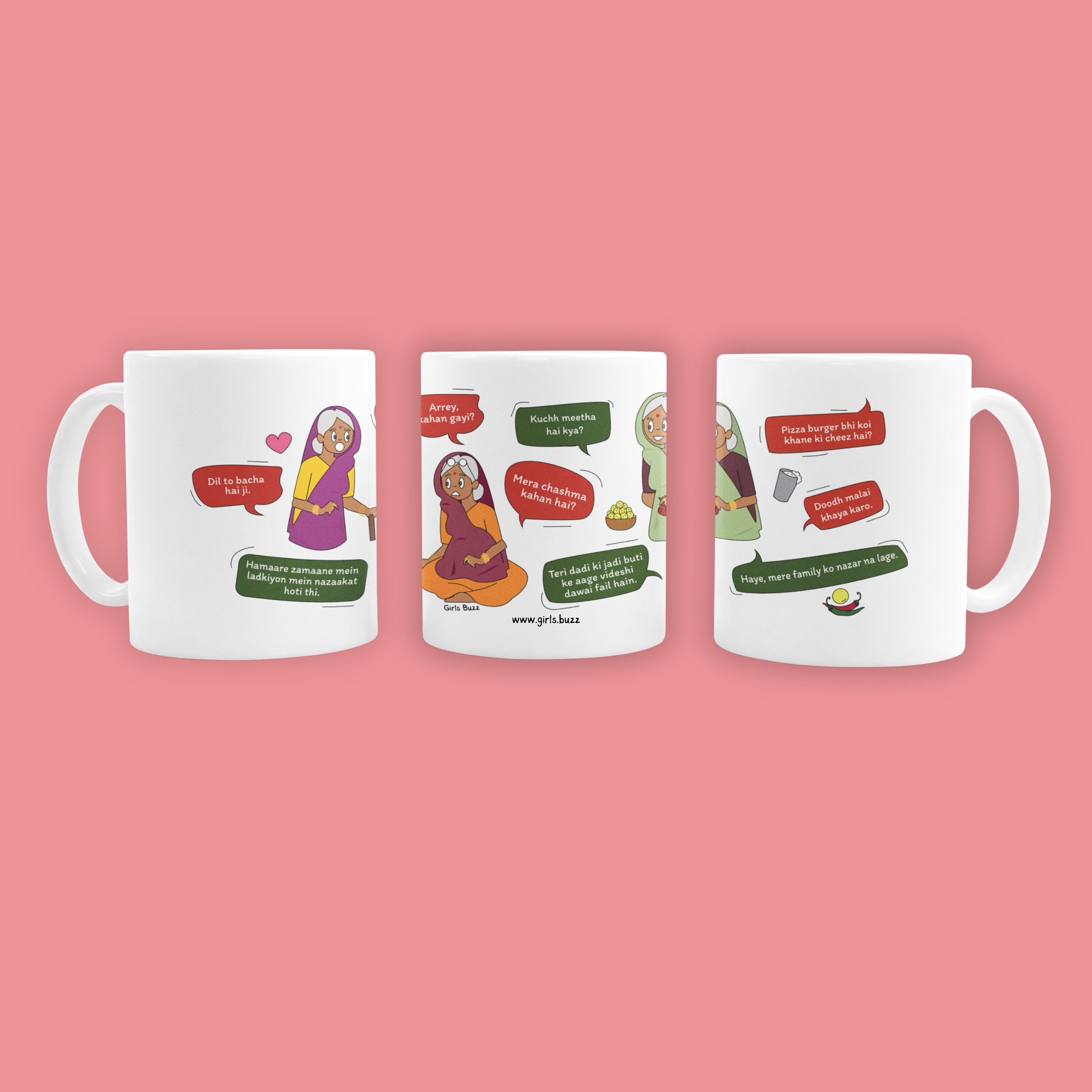 Isnāt it funny how Dadi has her own set of never-ending complaints, from misplacing her specs to sneaking sugar into her tea? Capture all her quirky habits with the Dadi and Her Complaints mug with quirky quotes from Hello Mili comics! Packed with funny Hindi quotes, this mug celebrates Dadiās lovable, forgetful nature. Perfect for birthdays or just a thoughtful gift, this special Girls Buzz Indian family collection reminds us how much we love Dadi, complaints and all!