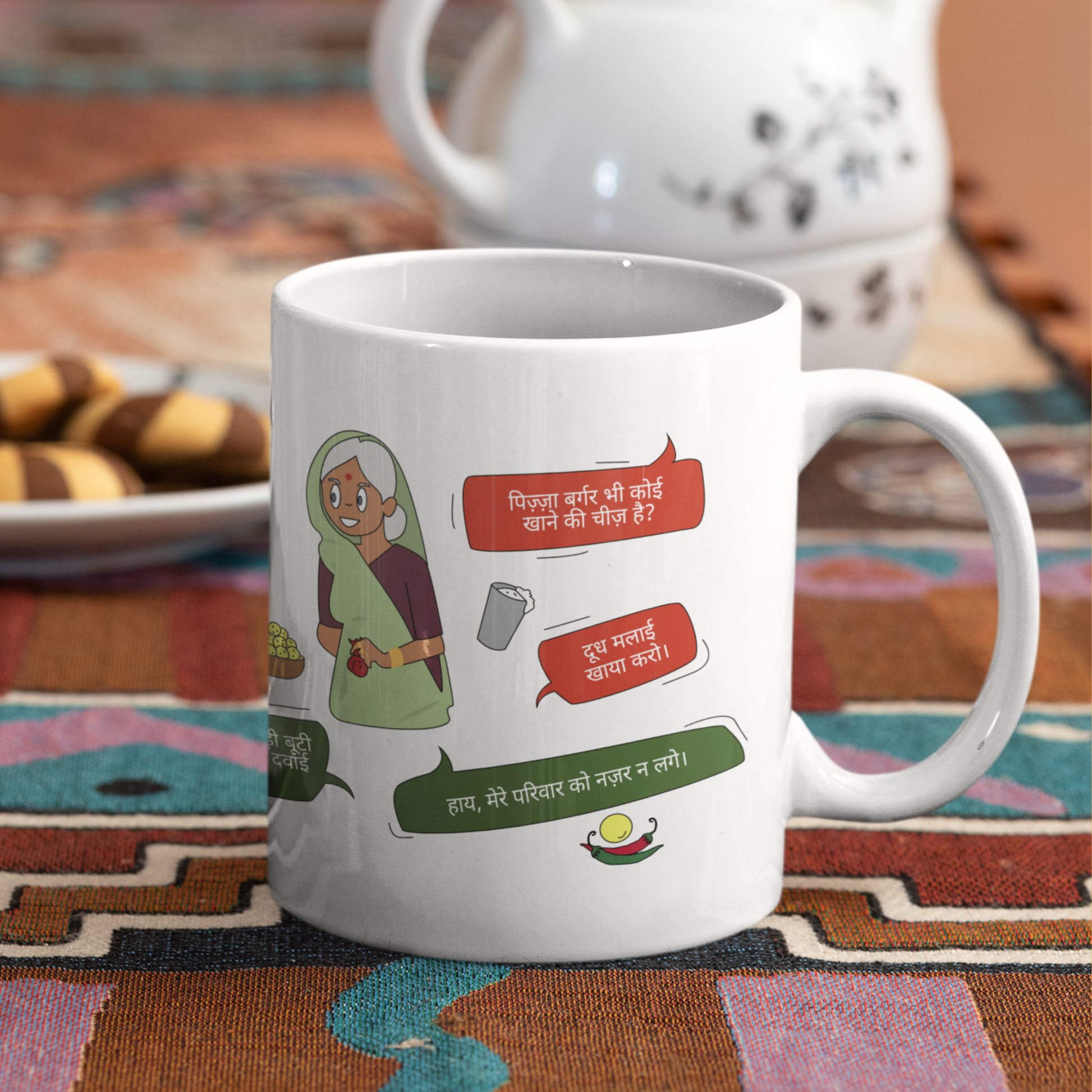 Isn’t it funny how Dadi has her own set of never-ending complaints, from misplacing her specs to sneaking sugar into her tea? Capture all her quirky habits with the Dadi and Her Complaints mug in Hindi from Hello Mili comics! Packed with funny Hindi quotes, this mug celebrates Dadi’s lovable, forgetful nature. Perfect for birthdays or just a thoughtful gift, this special Girls Buzz Indian family collection reminds us how much we love Dadi, complaints and all!