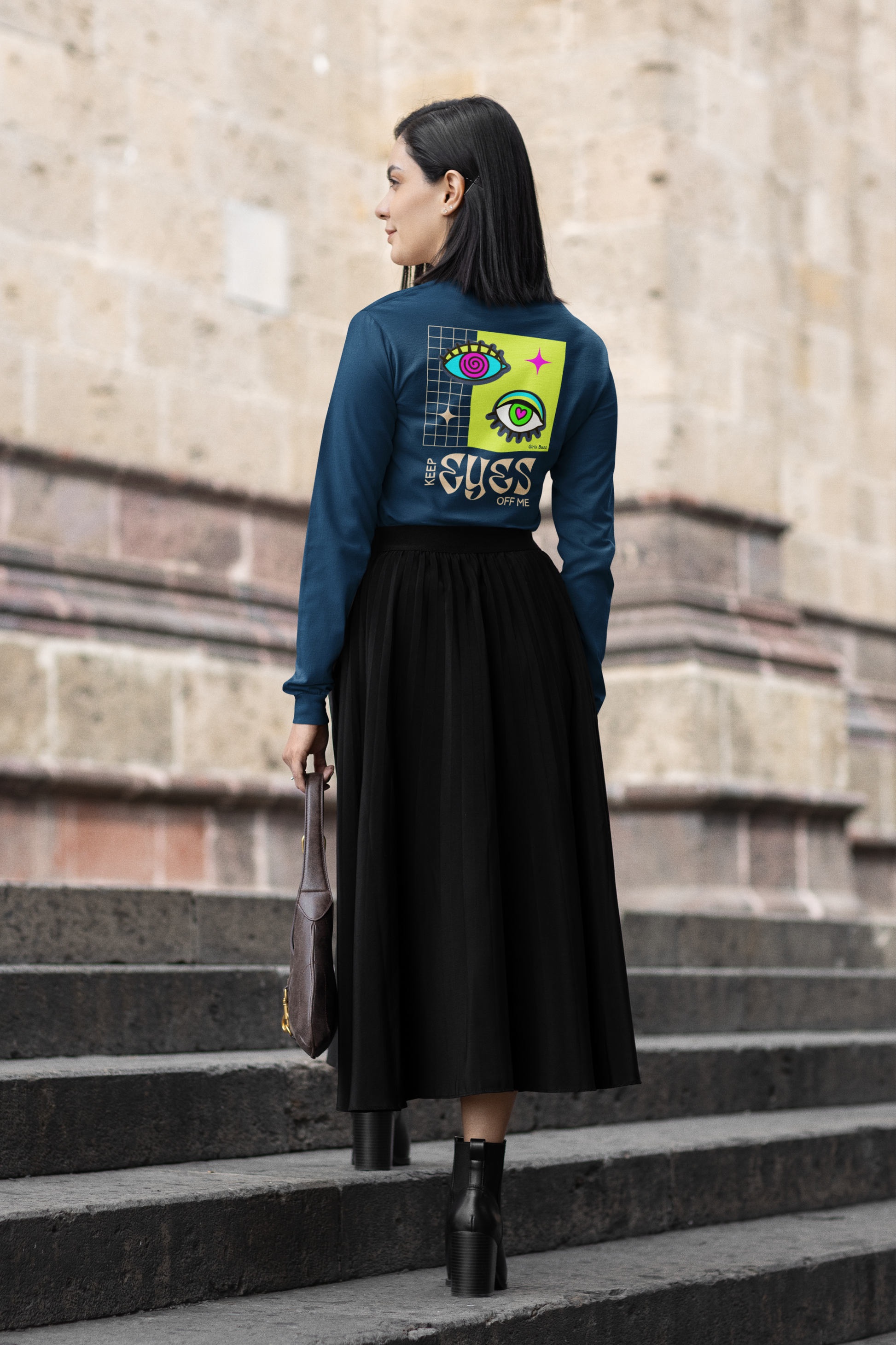 The bold design "Keep Your Eyes Off Me" sends a strong message from women to the world to refrain from unwarranted stares and glances. It carries a feminist message advocating for a safer environment for women, emphasizing that looking good or wearing certain clothes does not invite unwanted attention. The back print boldly communicates this message to those who trouble women on the streets.