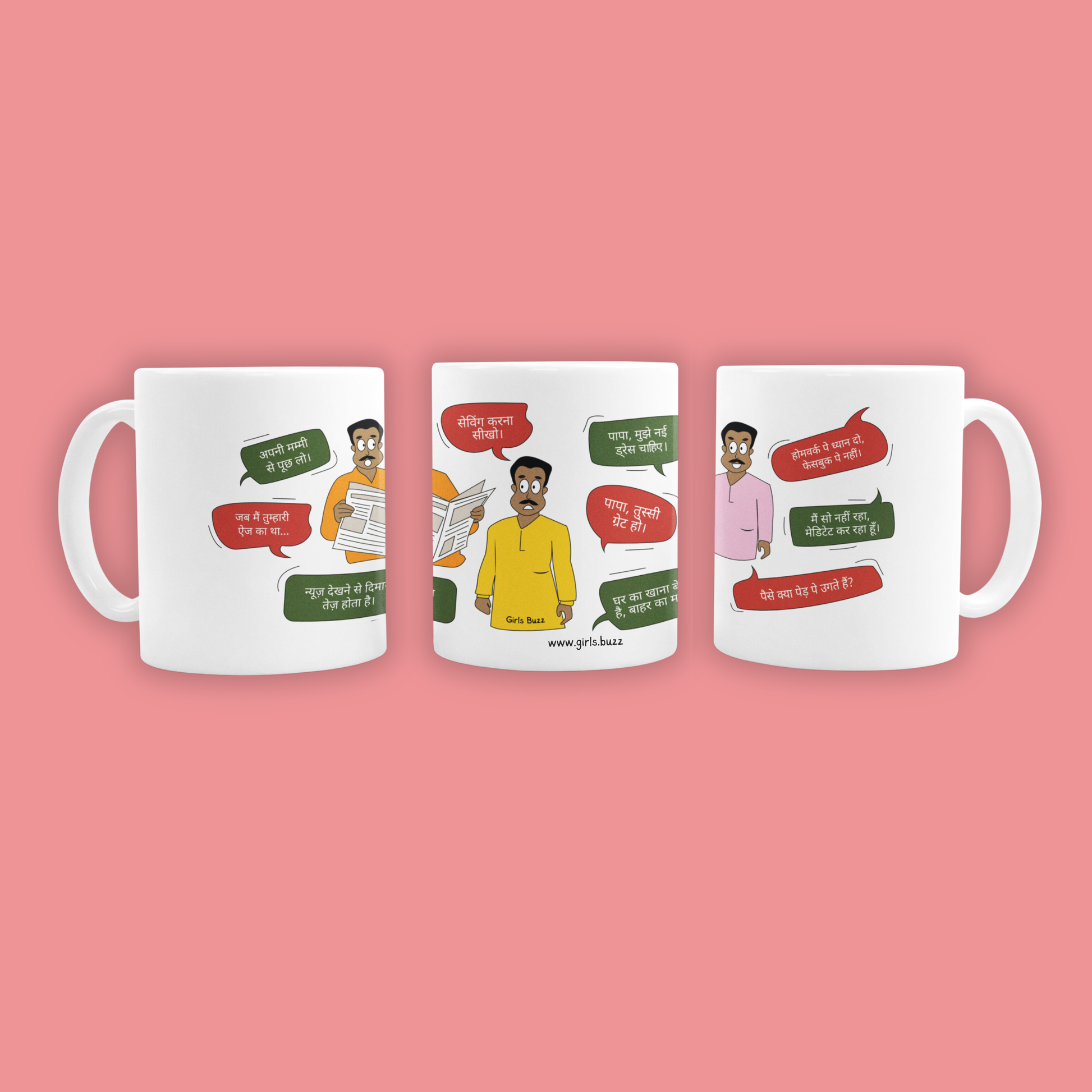The perfect gift for dads: a printed ceramic mug featuring the complaints our dads put up with, which we can all relate to. The Hello Mili's dad character is an embodiment of the love and support our fathers shower on us. Show your Appa, Papa, or Dad appreciation this Father's Day or on his birthday with this thoughtful gift idea.