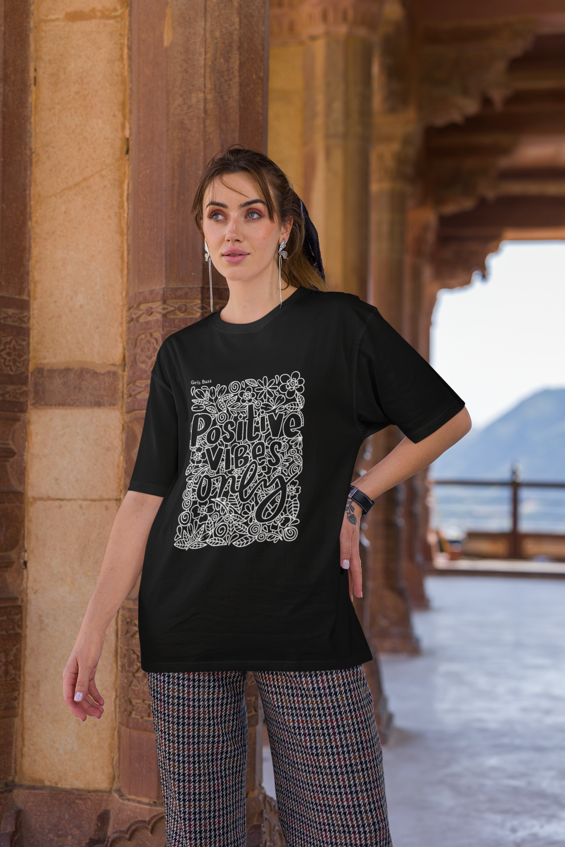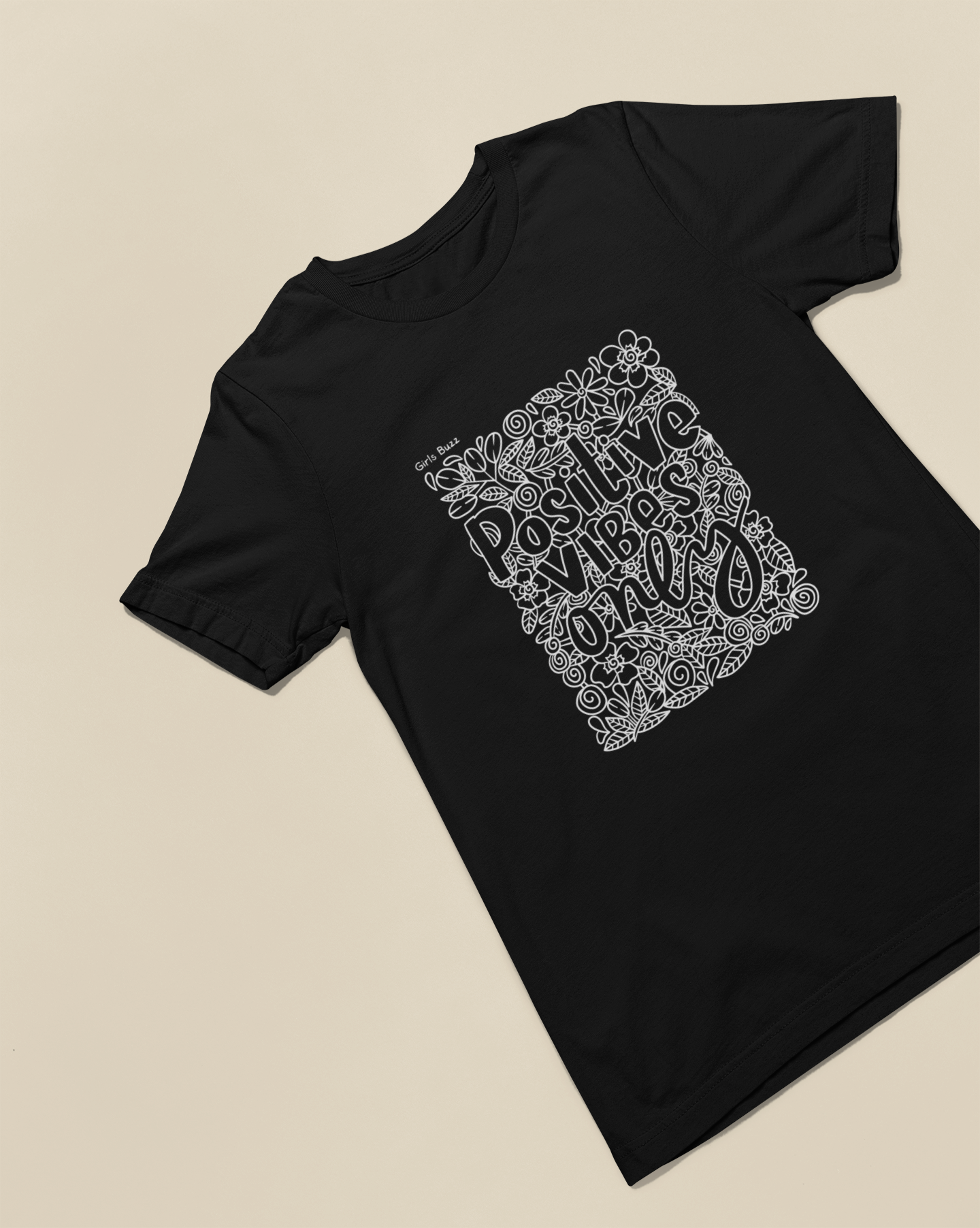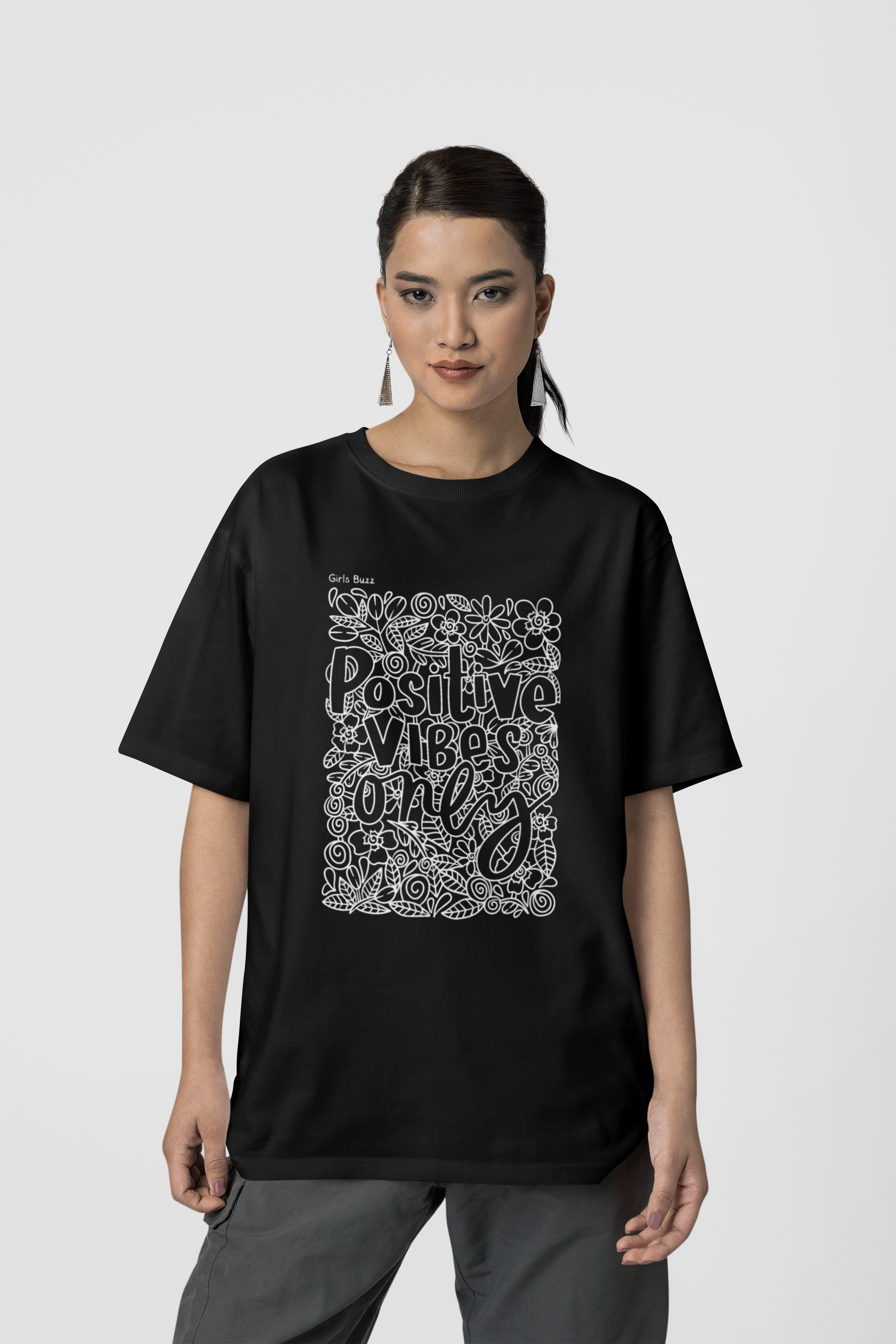 The beautiful doodle "Positive Vibes Only" oversized black t-shirt is a motivational slogan and daily affirmation for women. It's a reminder that there's room for only positive vibes in life.
