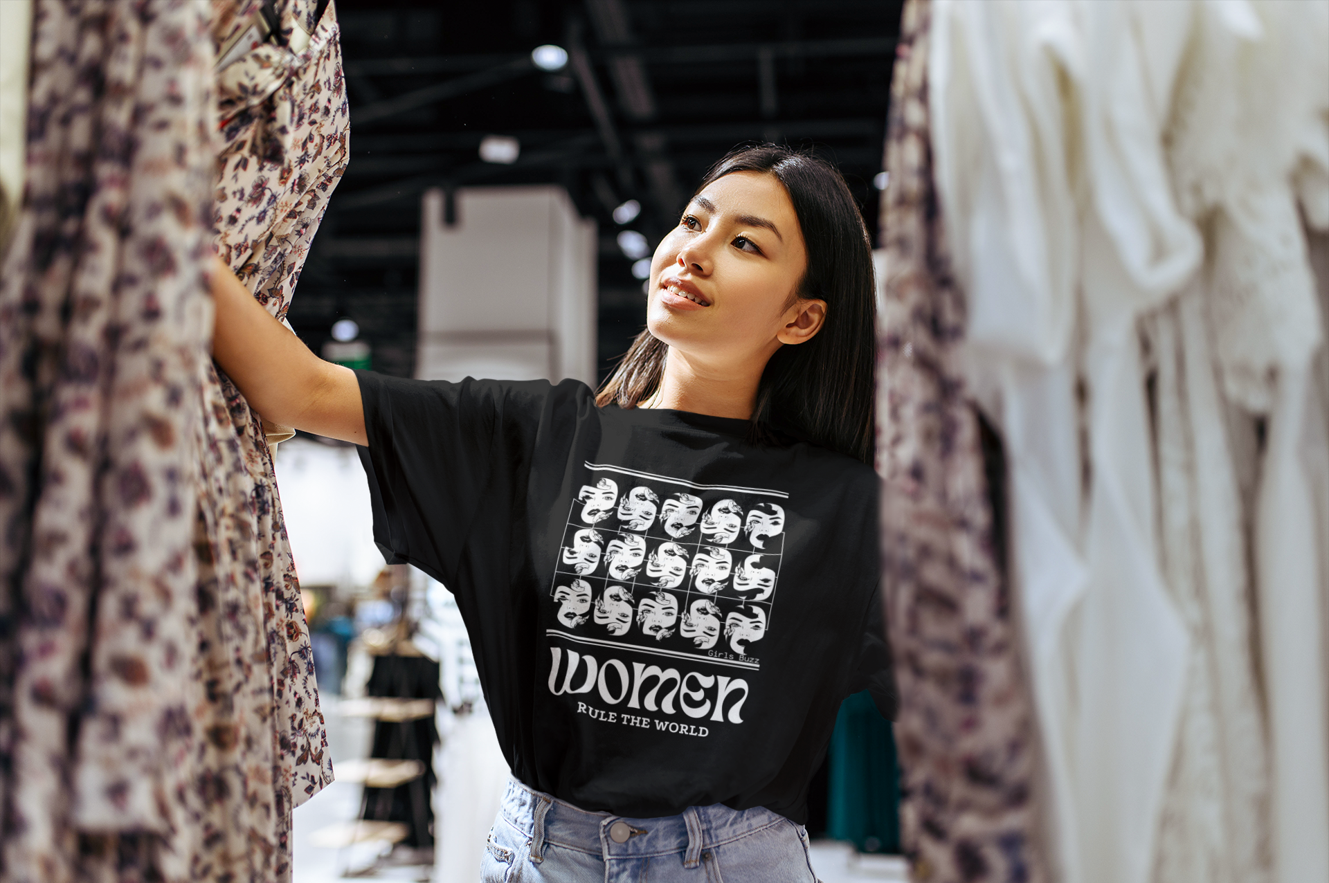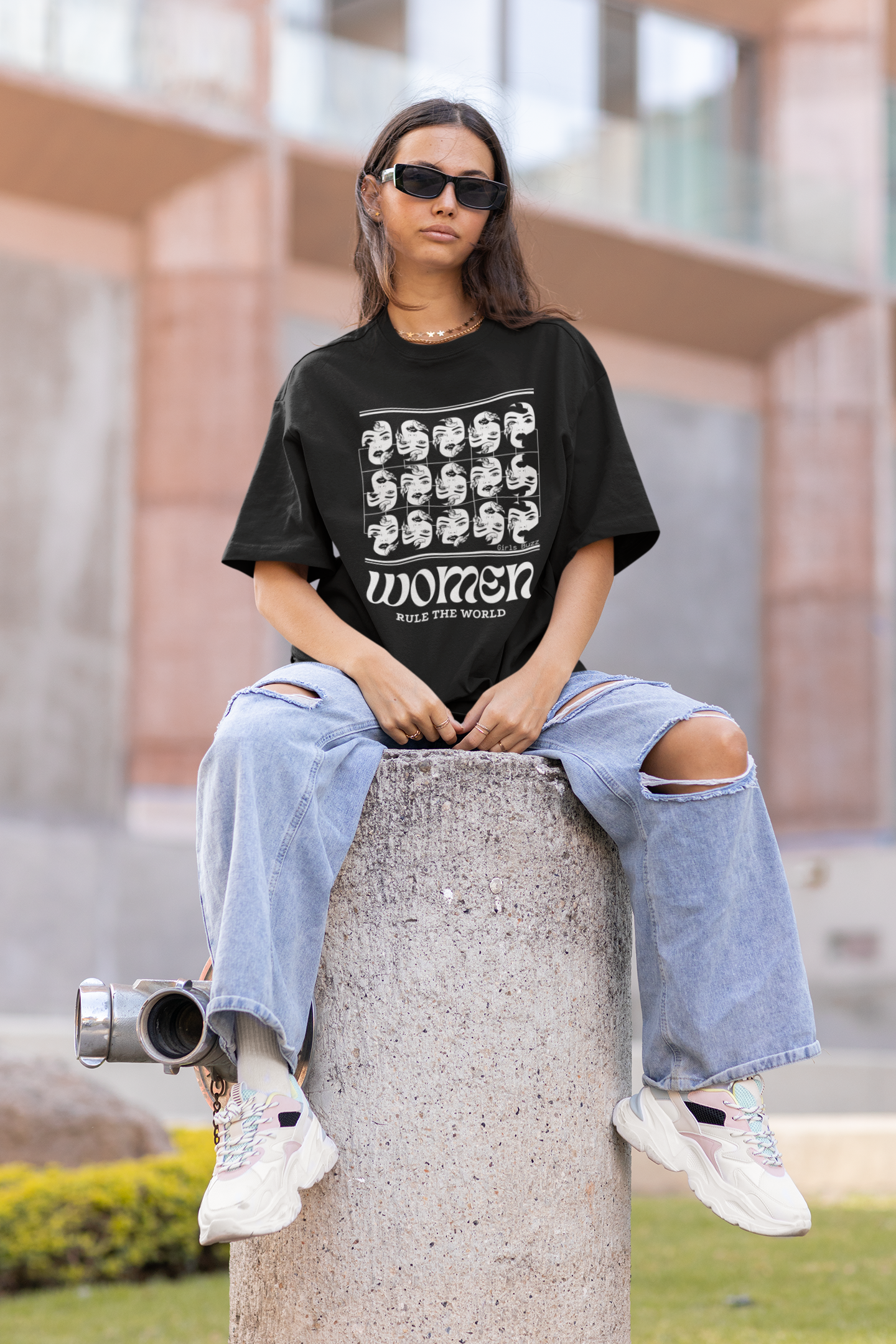 The t-shirt design features the quote 'Women Rule the World', celebrating women who take control of their lives and refuse to bow down.