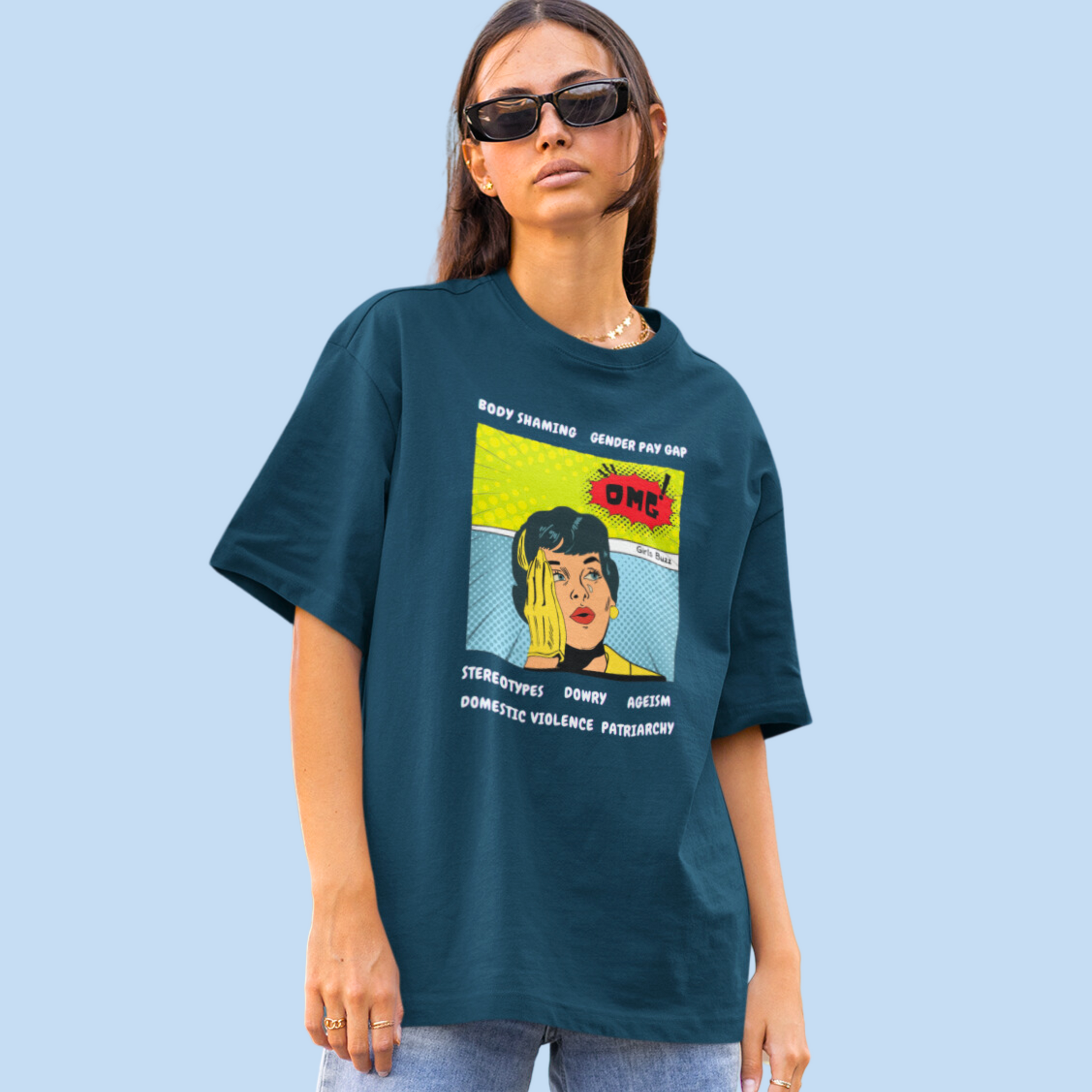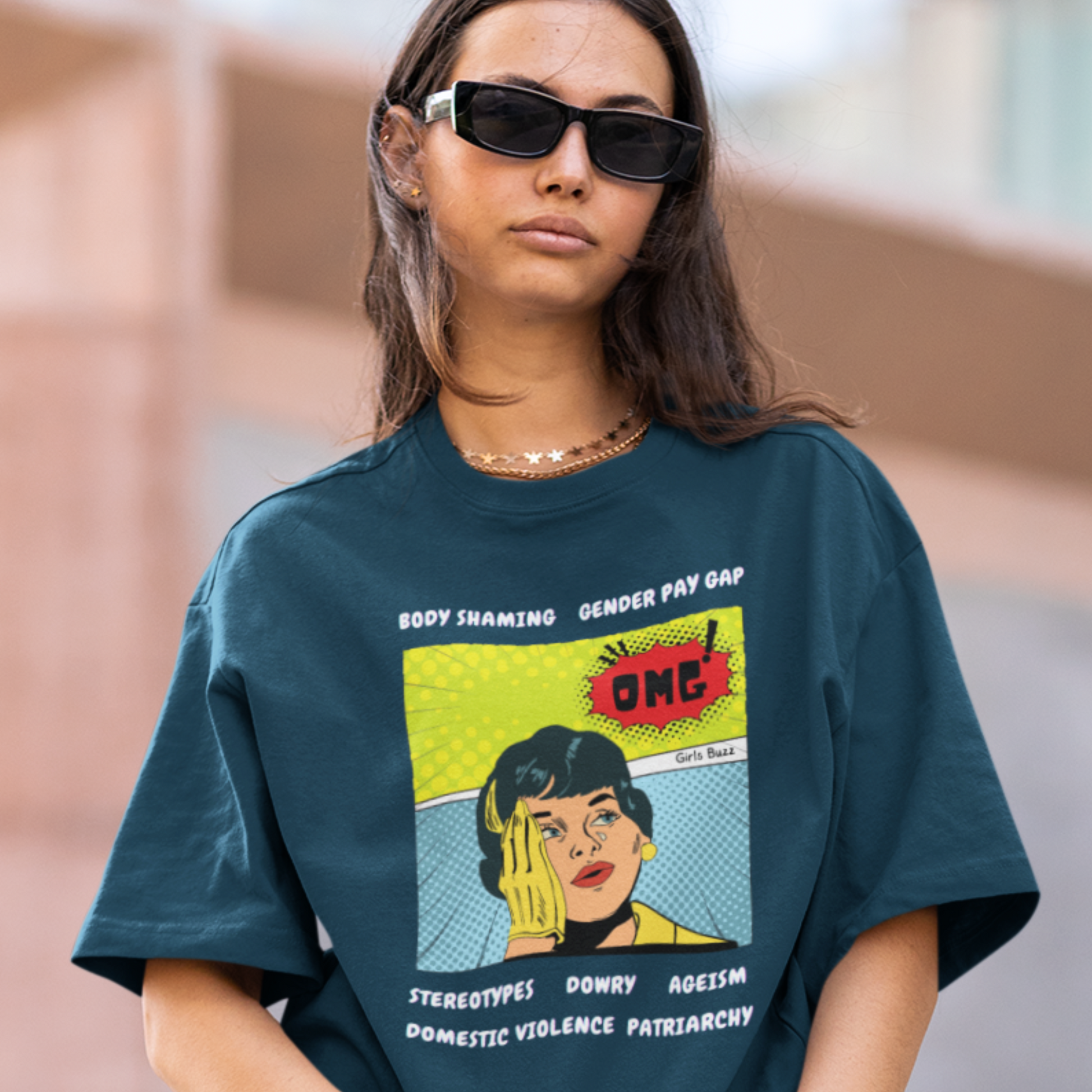 Capture the reality of societal pressures with the "Stereotype Overload Oversized Tee" from Girls Buzz! This statement piece features a powerful illustration of a woman with her mouth wide open, overwhelmed by the weight of stereotypes everyone imposes on her. It's a bold reminder that women should not be confined by rigid rules and expectations.