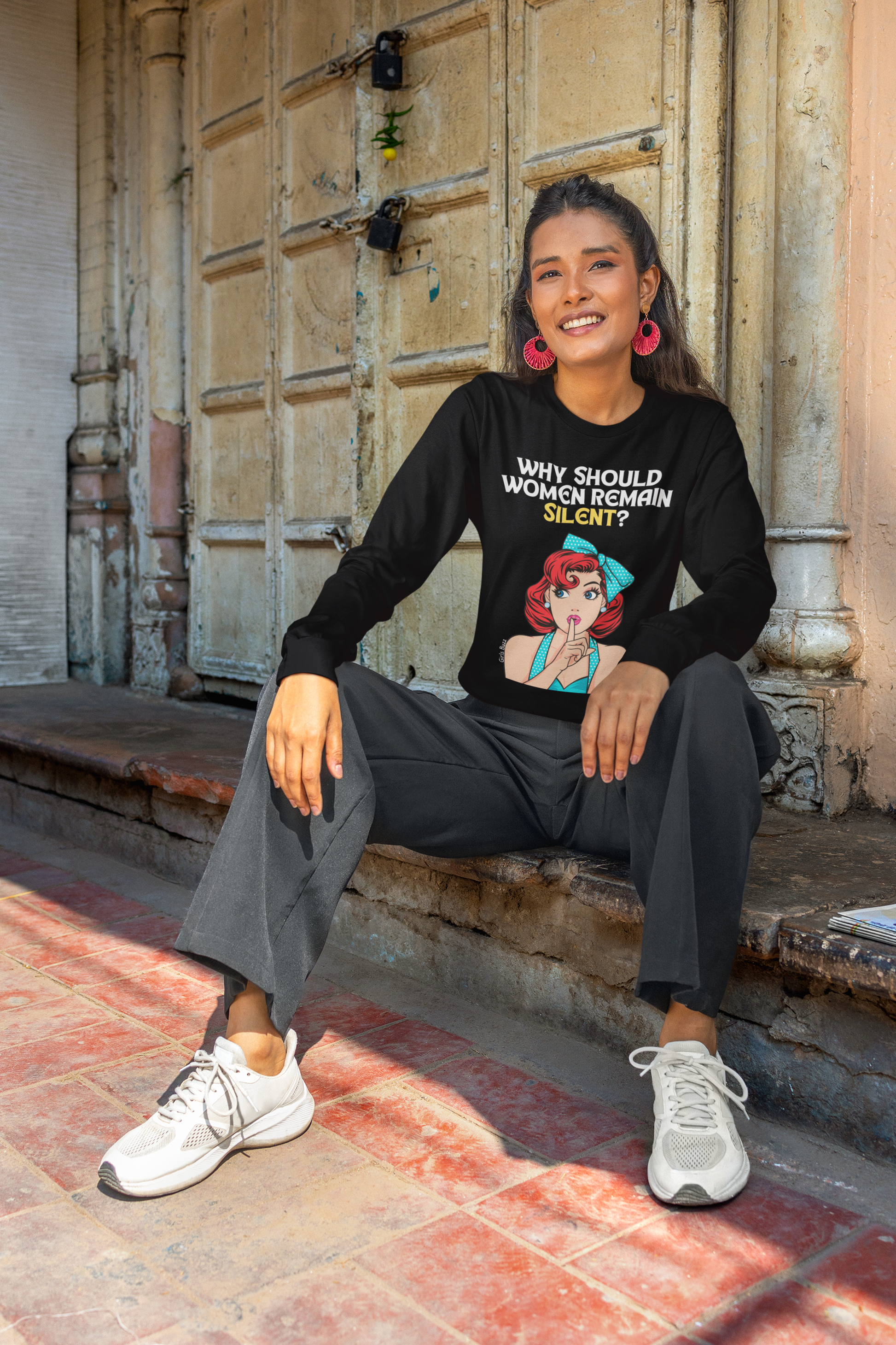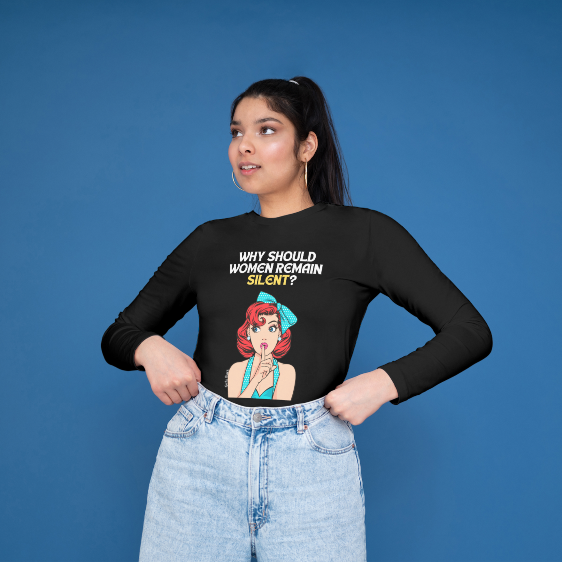 The 'Why Should Women Remain Silent' long sleeve t-shirt is a bold and impactful statement piece that aims to inspire women to break free from silence and reclaim their voices. This design fosters a sense of unity and solidarity among women, going beyond mere fashion to advocate for empowerment and change.
