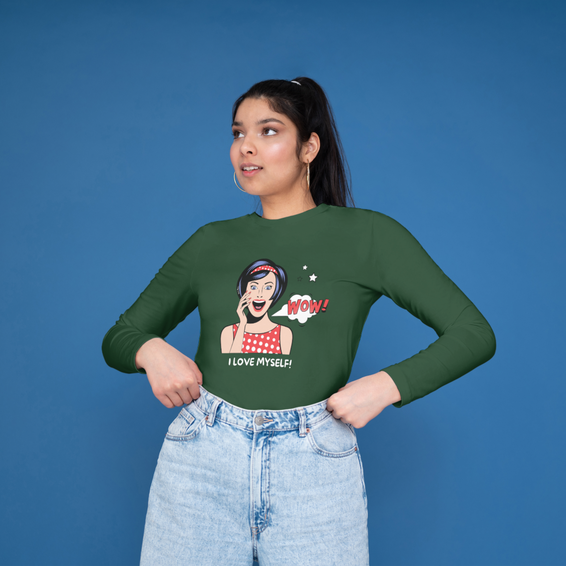 The 'Wow, I Love Myself' Women's long sleeve Girls Buzz t-shirt is all about celebrating self-love and empowerment, allowing you to wear your confidence proudly. With its minimalist design and stylish font spelling out the empowering message, accompanied by a playful comic print of a girl, this shirt exudes positivity and upliftment. Its relaxed fit ensures comfort without compromising style, making it a versatile piece for any occasion. Whether you're adding it to your own wardrobe or gifting it to a friend in need of a daily reminder of their worth, embrace the mantra and spread the message that self-love is timeless and always fashionable.